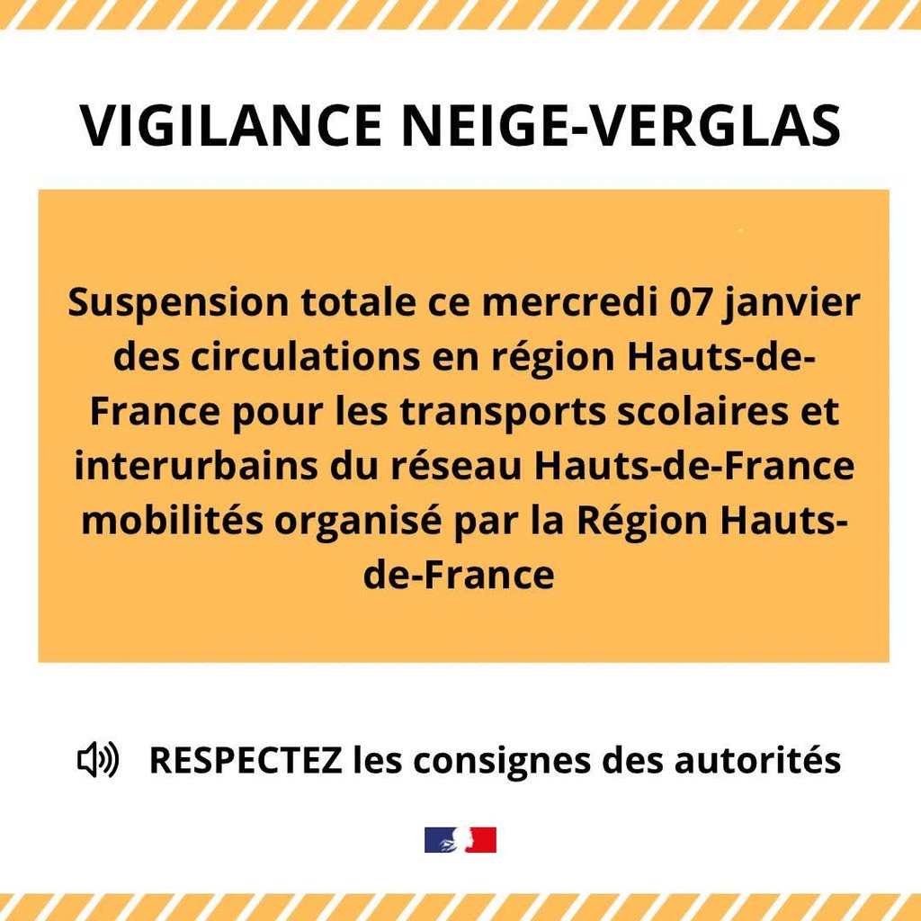 Suspension totale ce mercredi 07 janvier 2026 des circulations en région Hauts-de-France pour les transports scolaires et interurbains du réseau Hauts-de-France mobilités organisé par la Région Hauts-de-France.
