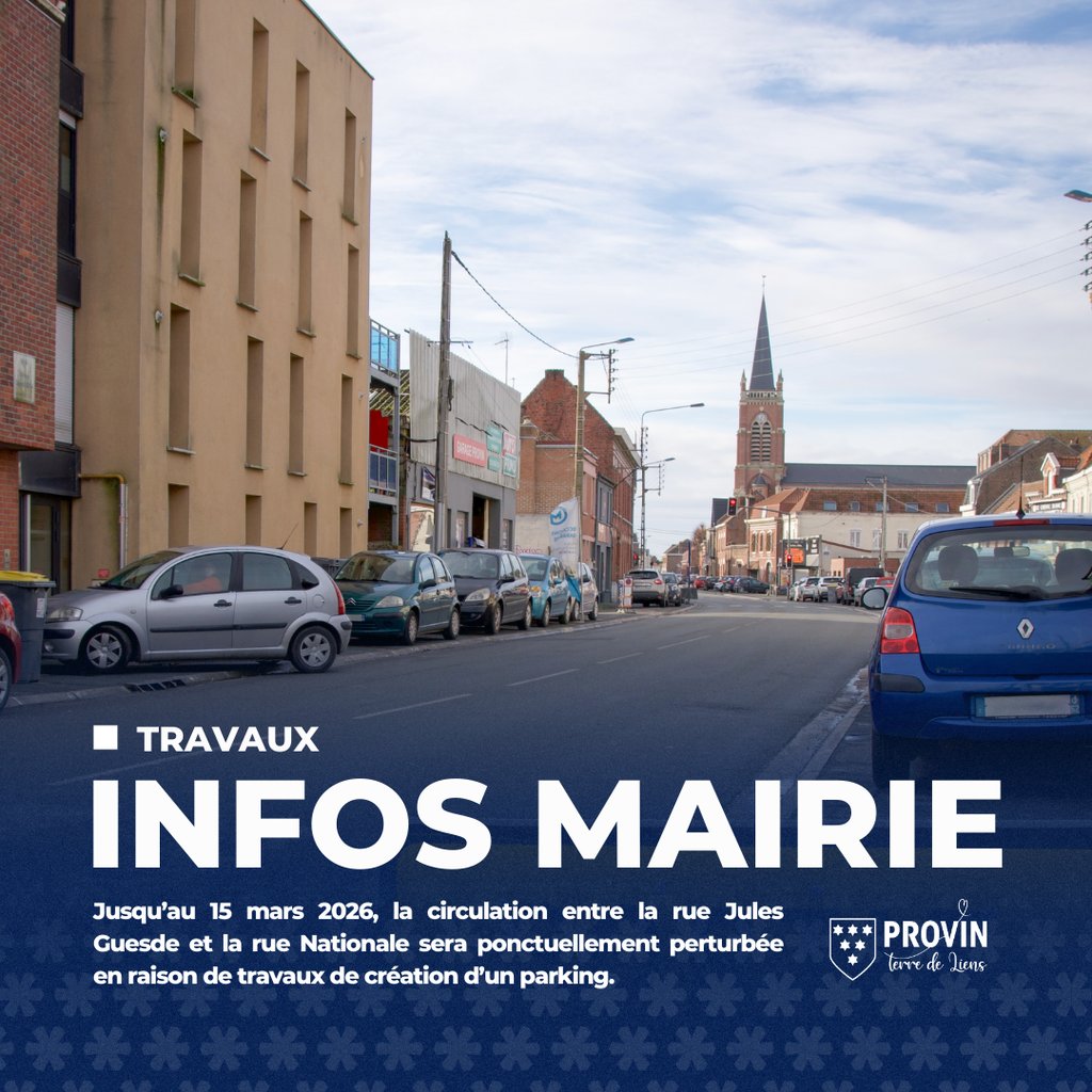 Jusqu'au 15 mars 2026, la circulation entre la rue Jules Guesde et la rue Nationale sera ponctuellement perturbée en raison de la création de l'aire de stationnement au 10 place Jean Jaurès.