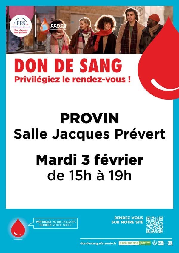 La Ville de Provin, en partenariat avec lâĂtablissement Français du Sang (EFS), vous rappelle quâune collecte de sang est organisĂ©e aujourdâhui, mardi 3 fĂ©vrier, jusquâĂ 19h.
