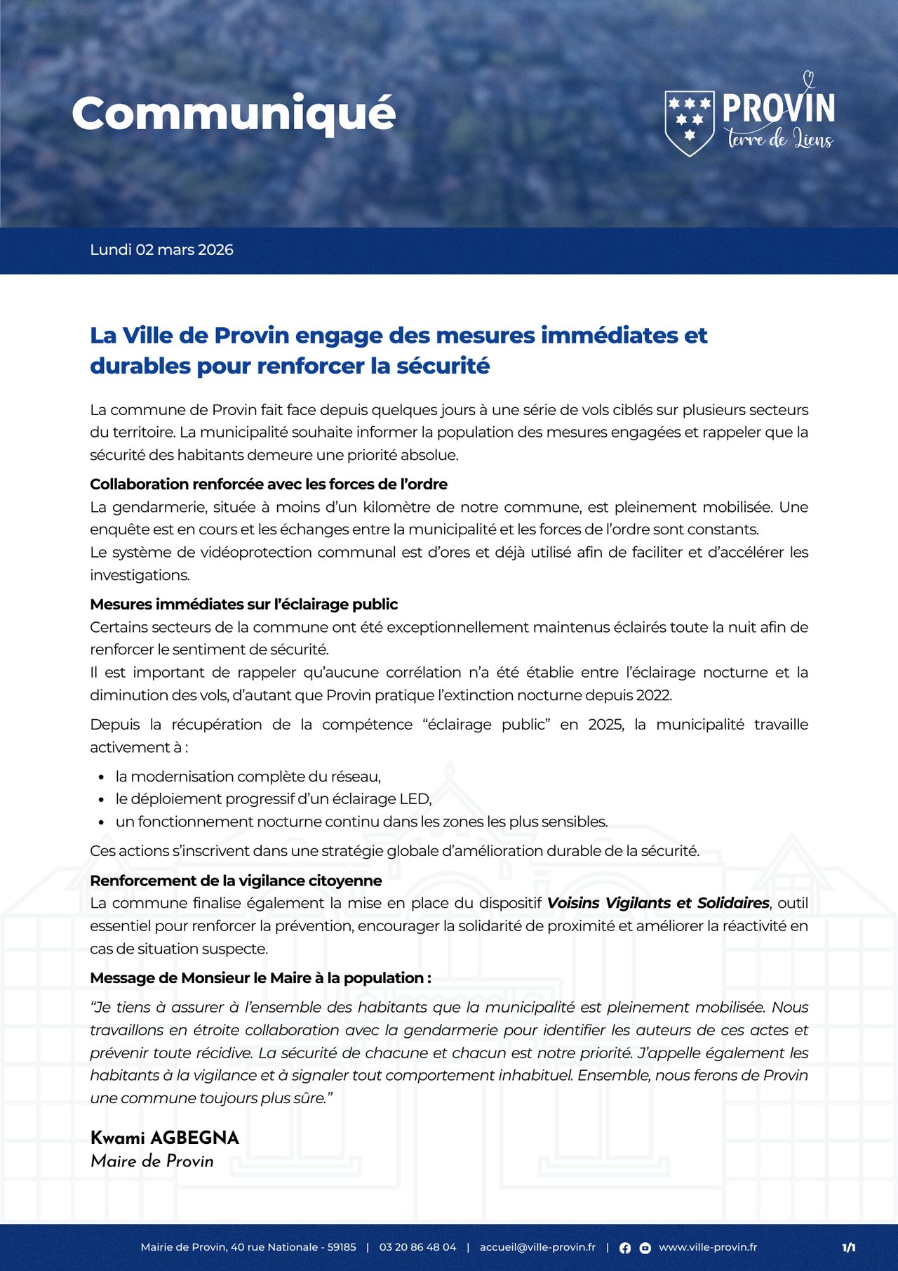 Nous vous informons de la publication d’un communiqué de Monsieur le Maire, Kwami Agbegna, relatif aux récents faits de vols constatés sur le territoire communal et aux mesures de sécurité mises en œuvre.